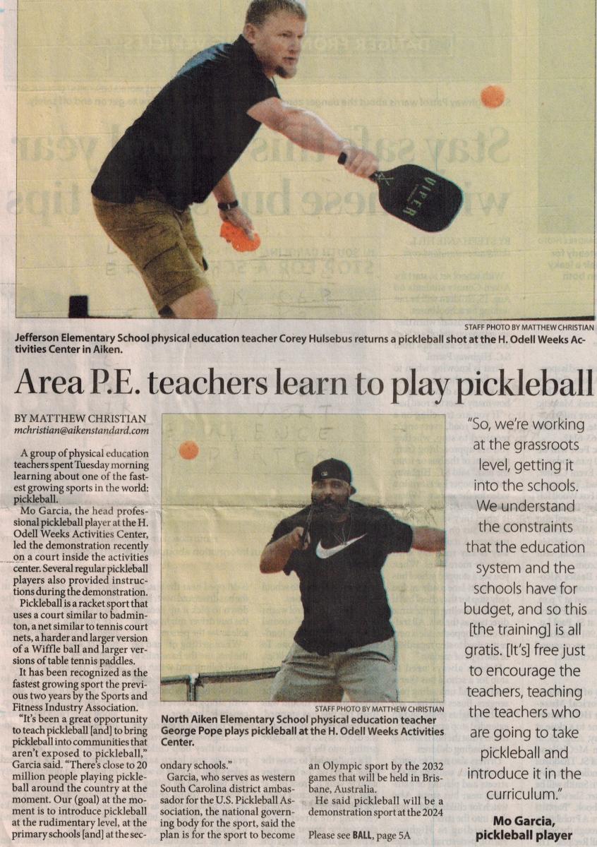 Last week over one hundred people from the ages of seven to seventy-five were introduced to pickleball. On Tuesday Aiken Pickleball, led by Mo Garcia (our head teaching professional) held a clinic for over fifty Aiken County Physical Education Teachers to help them introduce pickleball to their students. The event was written up in the Aiken Standard. On Thursday and Friday of last week, Aiken Pickleball also provided pickleball clinics as part of the City's Summer Camp Program. And on Saturday, eight people attended a New Players Clinic.