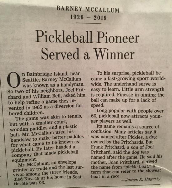 Below is a copy of an obituary from the Wall Street Journal for Barney McCallum (1926-2019), who just passed away at the age of 93. He is being credited for refining the game of pickleball. It also provides a different version on how the game got its name.